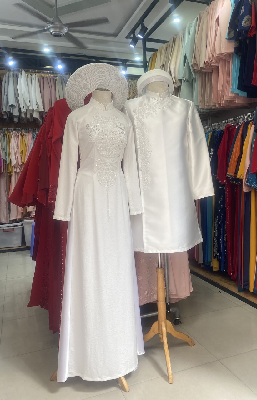 ÁO DÀI CẶP TRẮNG KẾT LÔNG VŨ