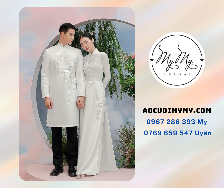 ÁO DÀI CẶP CÔ DÂU CHÚ RỂ TONE TRẮNG THÊU LOAN PHƯỢNG