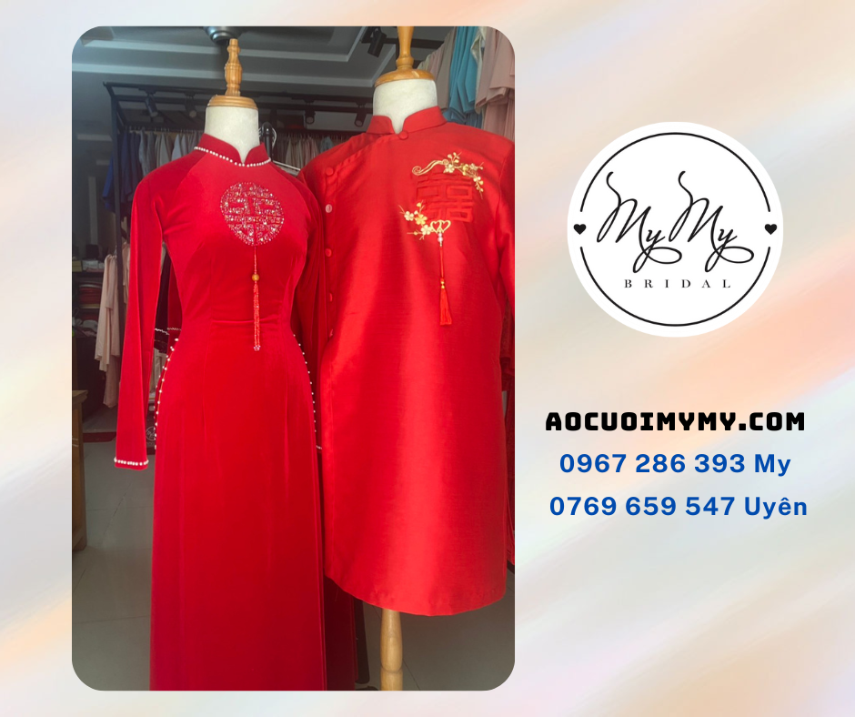 ÁO DÀI CẶP ĐỎ KẾT HOA HỒNG