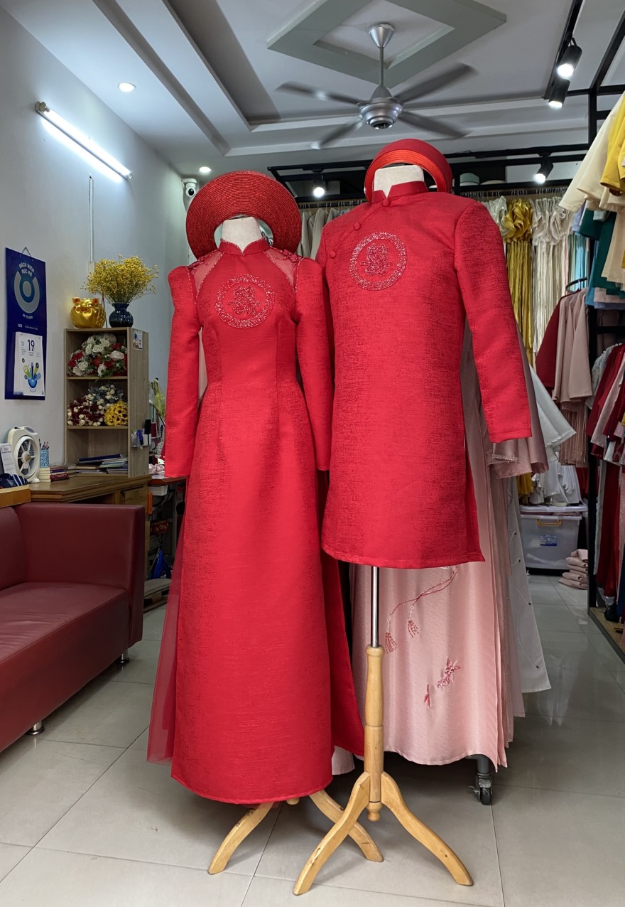 - Bộ áo dài nam: Cũng có màu đỏ đồng bộ, áo dài nam có kiểu dáng cứng cáp hơn, với tay dài và cổ cao. Thiết kế giản dị nhưng không kém phần lịch lãm, phù hợp cho các sự kiện trọng đại.