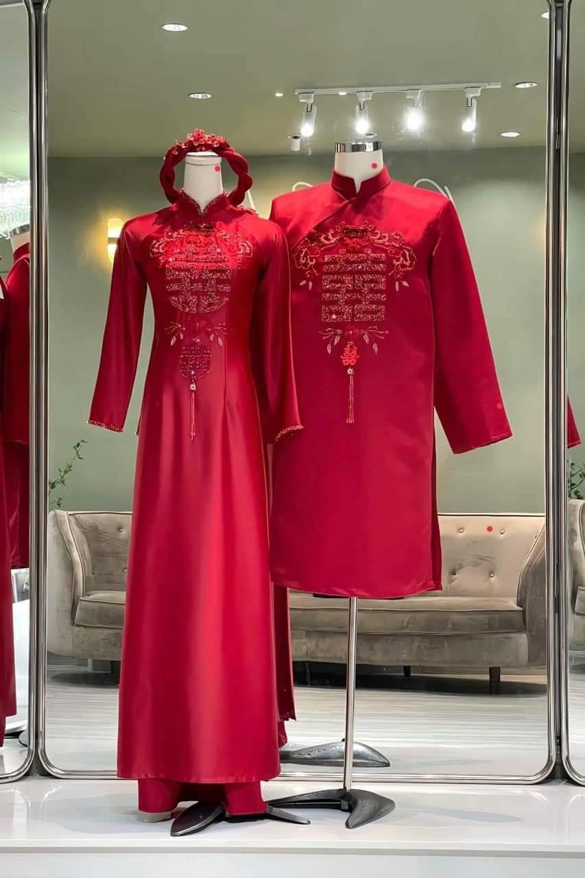 ÁO DÀI CẶP ĐỎ KẾT HOA HỒNG