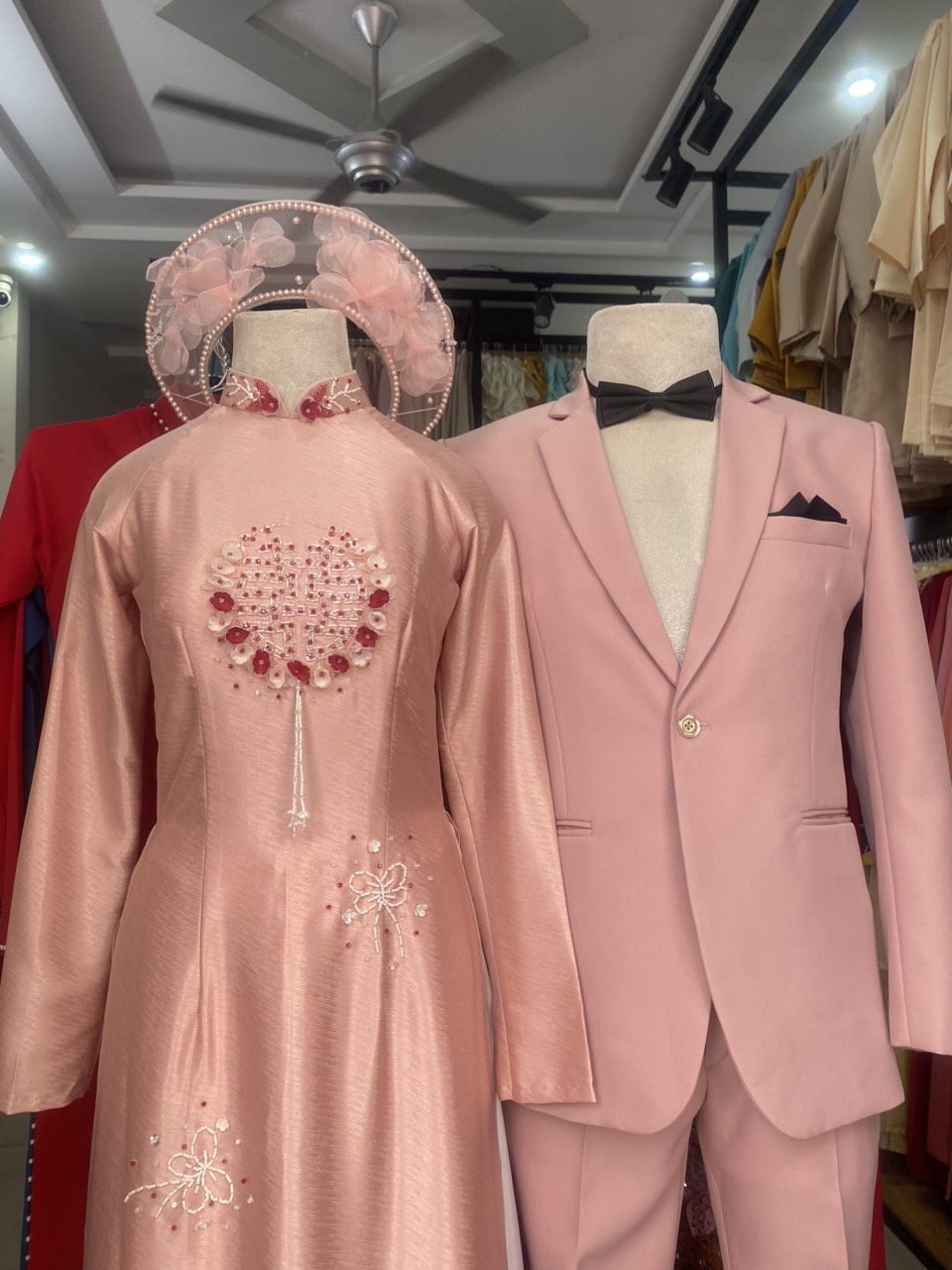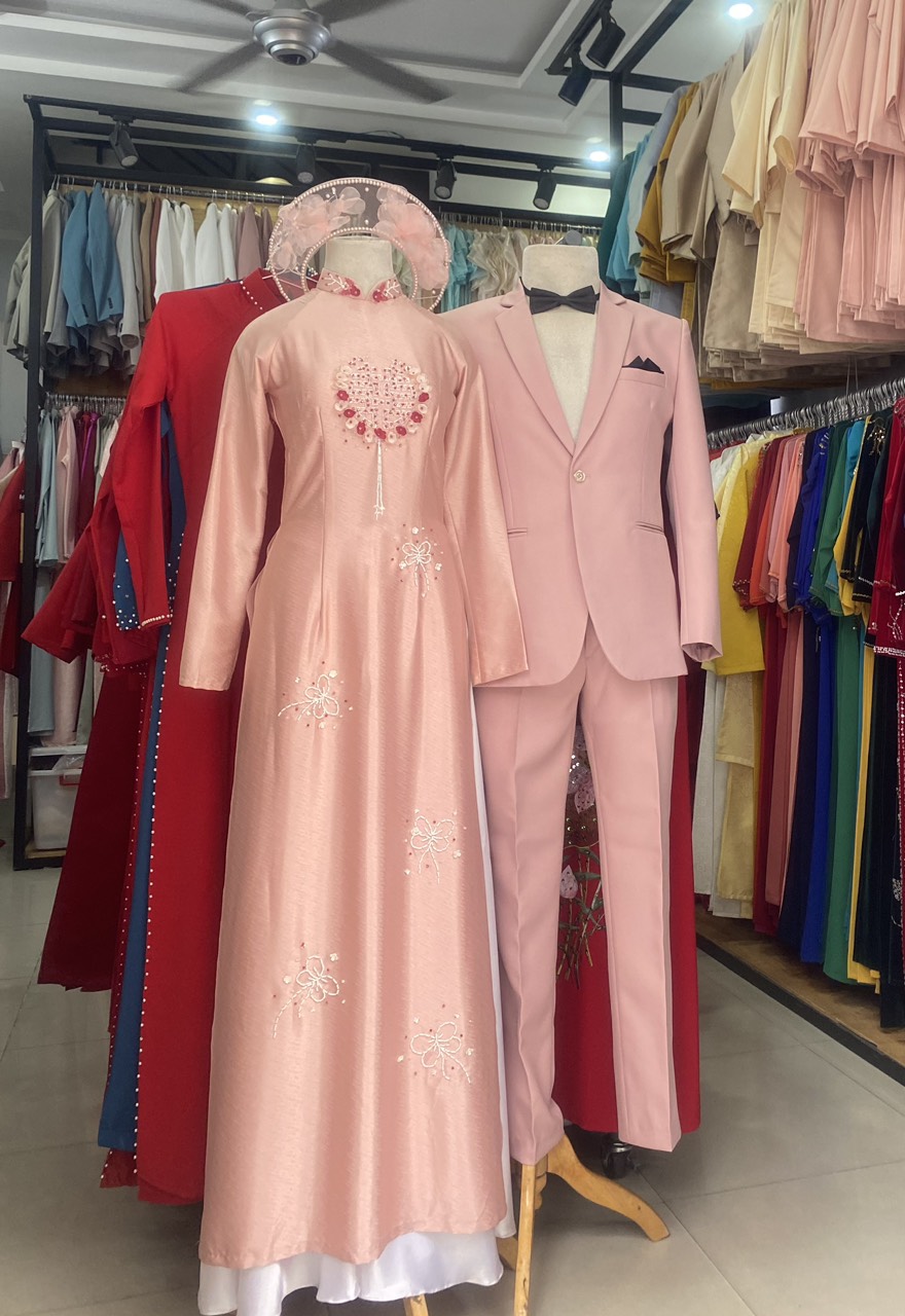 Áo dài cặp màu hồng đính kết chữ hỷ và hoa nhí tạo nên nét trẻ trung , duyên dáng