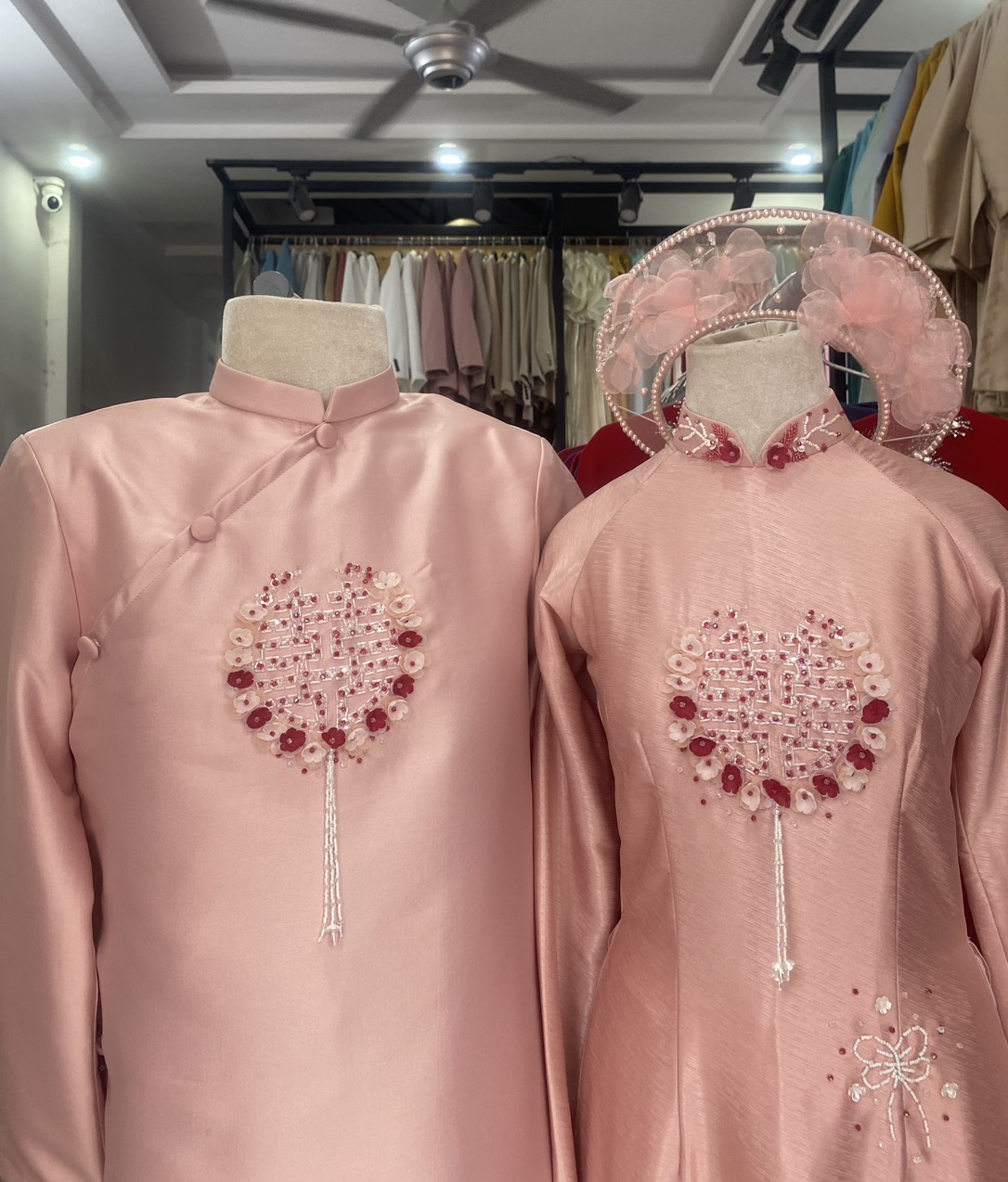Áo dài cặp màu hồng đính kết chữ hỷ và hoa nhí tạo nên nét trẻ trung , duyên dáng