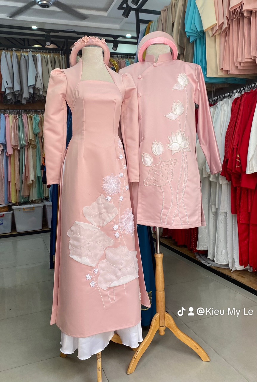Áo dài cặp hồng đính kết hoạ tiết hoa sen màu trắng