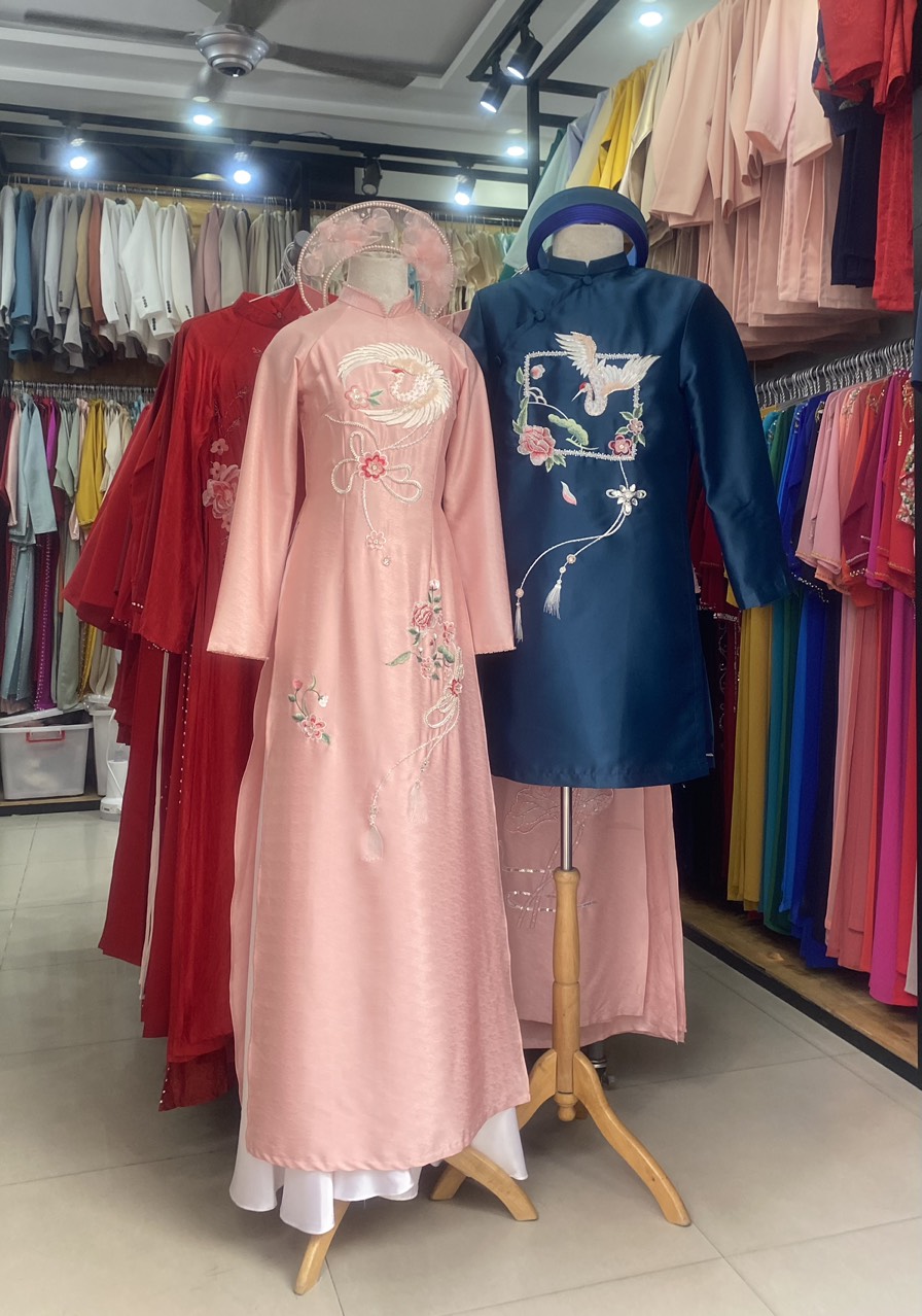 Áo dài cặp phối hồng và xanh thêu và đính kết họa tiết chim phượng hoàng phối với hoa
