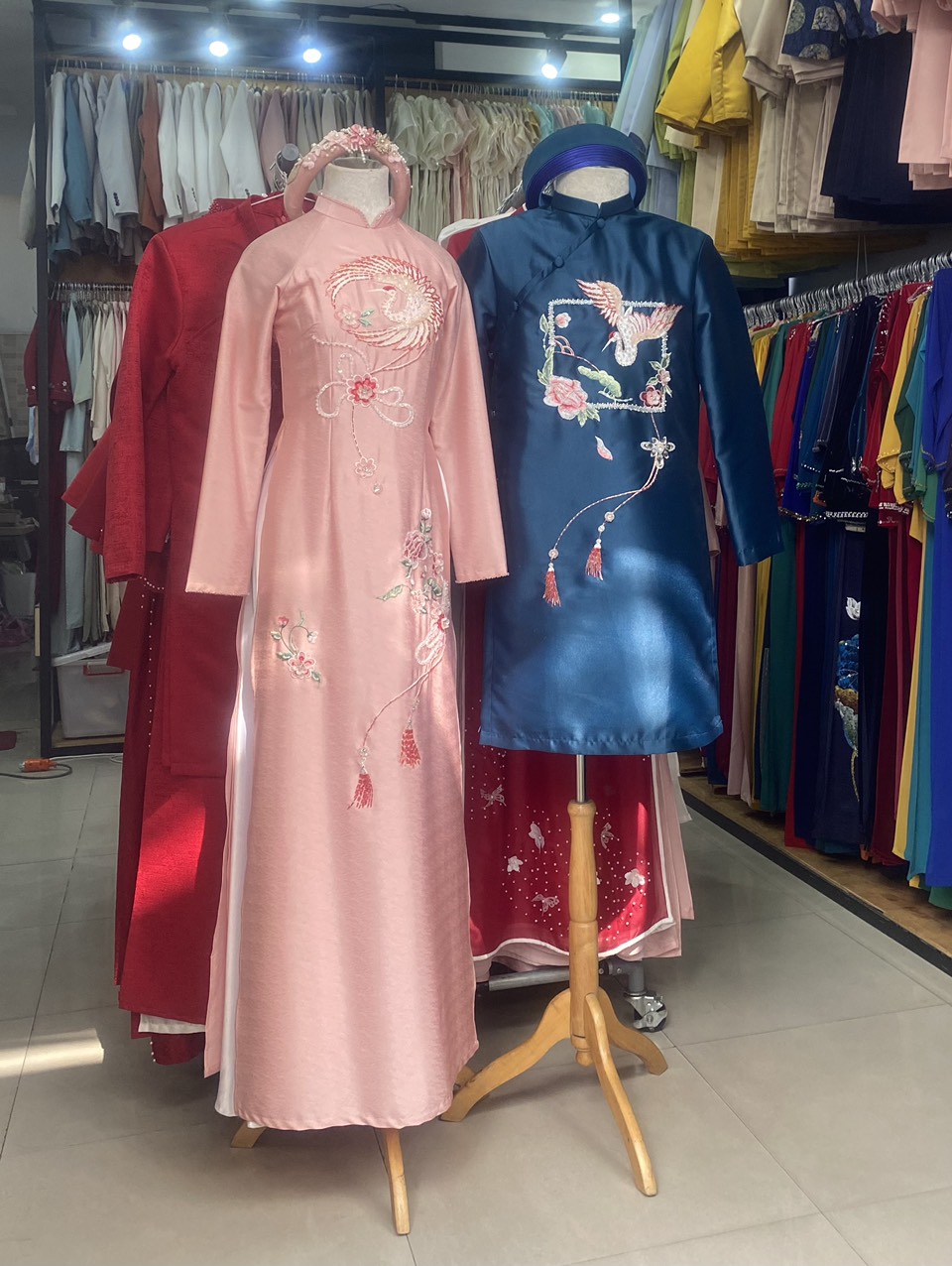 ÁO DÀI CẶP ĐỎ KẾT HOA HỒNG