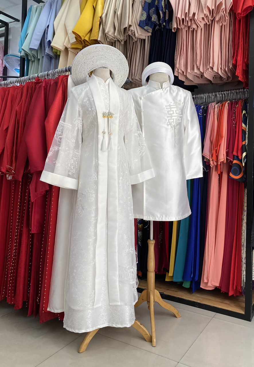 - Bộ áo dài cặp với gam màu trắng thanh thoát, biểu tượng của sự thuần khiết và trang trọng, thường được lựa chọn cho các dịp trọng đại như lễ cưới.