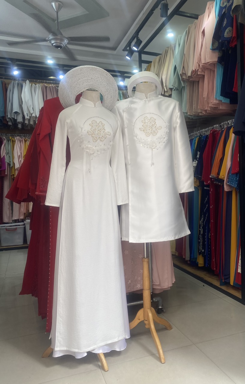 Áo dài cặp trắng chất liệu lụa óng với đính kết chữ hỷ và vòng hoa nổi