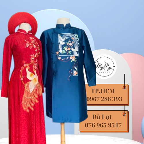 Áo dài cặp với áo cô dâu đỏ chất liệu tơ tằm và áo chú rể tacta màu xanh nhớt