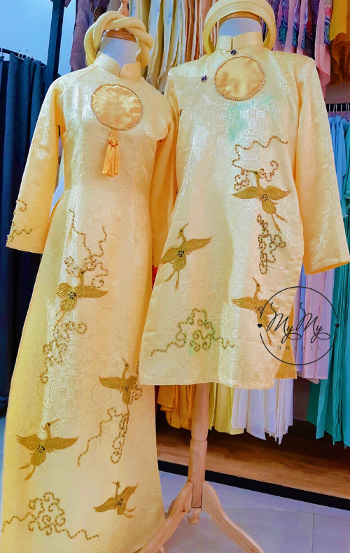 Cặp áo dài Cô Dâu - Chú Rể màu vàng nhẹ nhàng, cùng với họa tiết thêu chim hạt nổi bật sẽ làm cho những thướt hình của bạn trở nên long lanh hơn bao giờ hết.