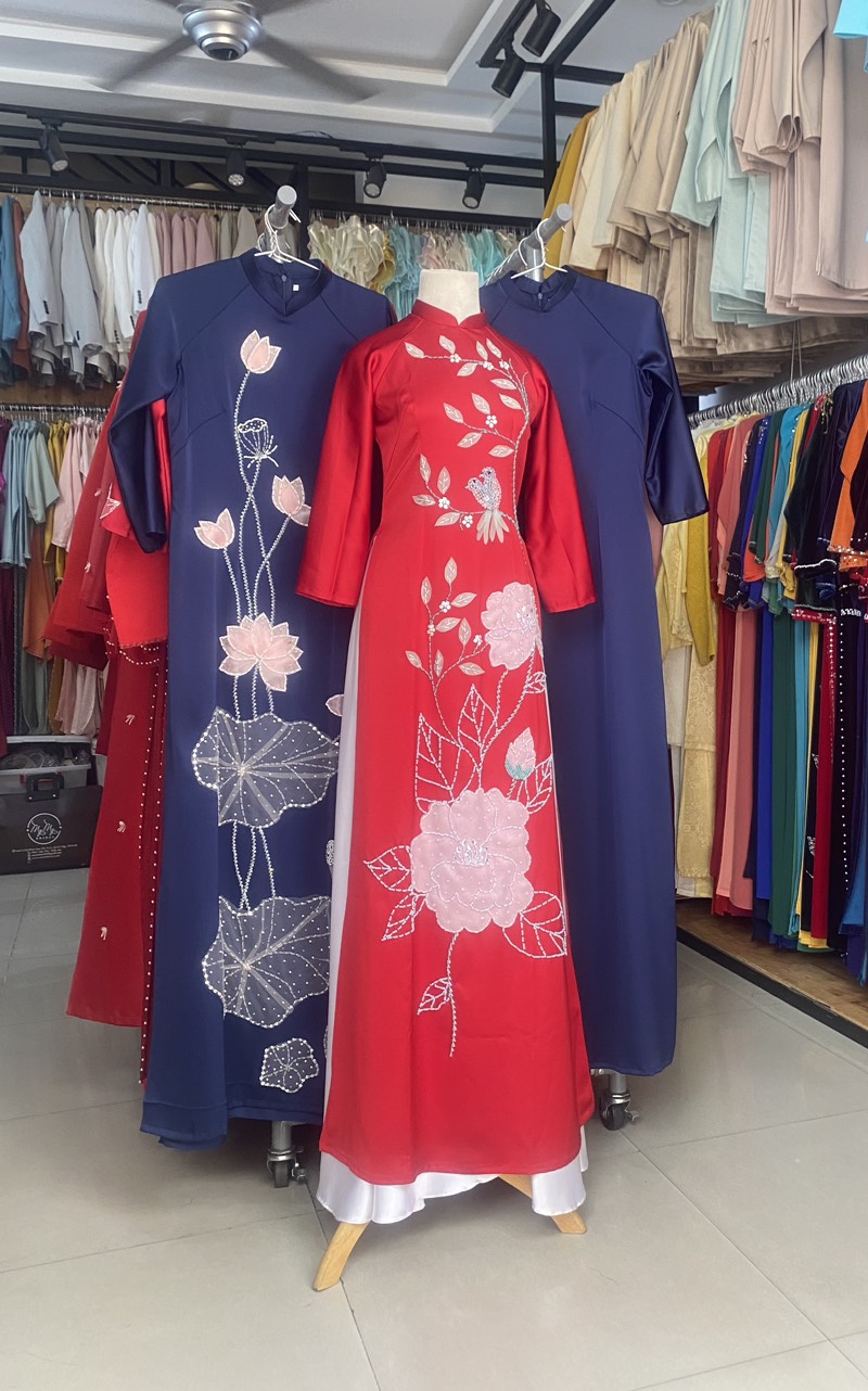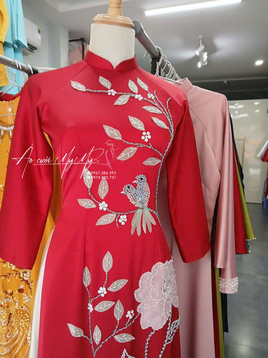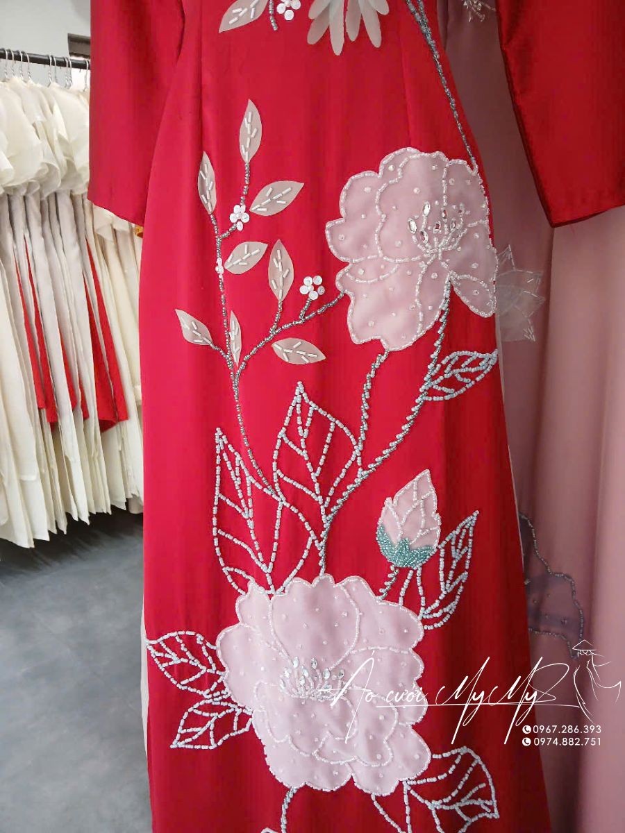 Áo dài bà sui màu đỏ đính kết hoa hồng