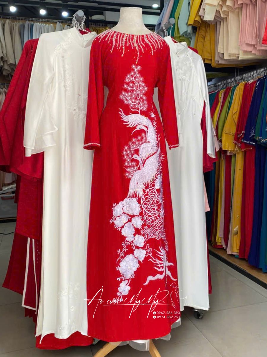 Cho thuê áo dài bà sui đỏ chim phượng và hoa mẫu đơn – thiết kế sang trọng, quý phái dành cho mẹ cô dâu chú rể. Áo dài được làm từ chất liệu lụa cao cấp, mềm mịn. Họa tiết chim phượng biểu tượng cho sự cao quý, kết hợp hoa mẫu đơn biểu tượng cho phúc lộc, mang ý nghĩa an lành trong ngày quan trọng. Phù hợp mặc trong lễ cưới hỏi, ra mắt, chụp hình gia đình.