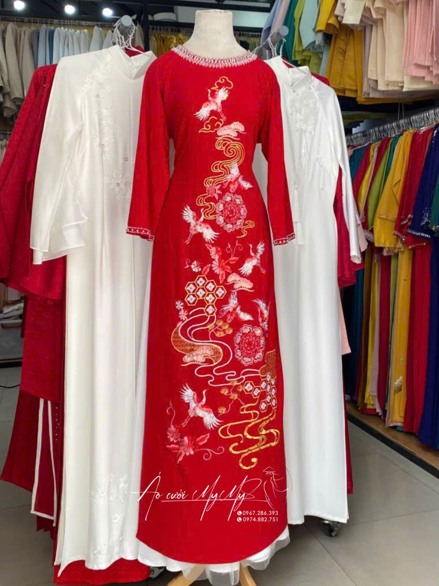 Cho thuê áo dài bà sui màu đỏ nổi bật với họa tiết hạc, hoa sen – biểu tượng của hạnh phúc, quyền quý và phúc thọ. Thiết kế cổ điển, tà dài sang trọng, phù hợp cho mẹ cô dâu chú rể trong lễ cưới, lễ hỏi hoặc chụp ảnh gia đình. Chất liệu lụa mềm mại, mát mẻ.