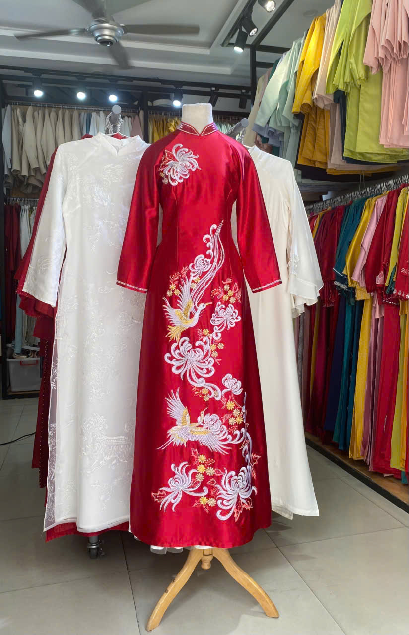 ÁO DÀI BÀ SUI ĐỎ THÊU HOA CÚC VÀ PHƯỢNG HOÀNG TRẮNG