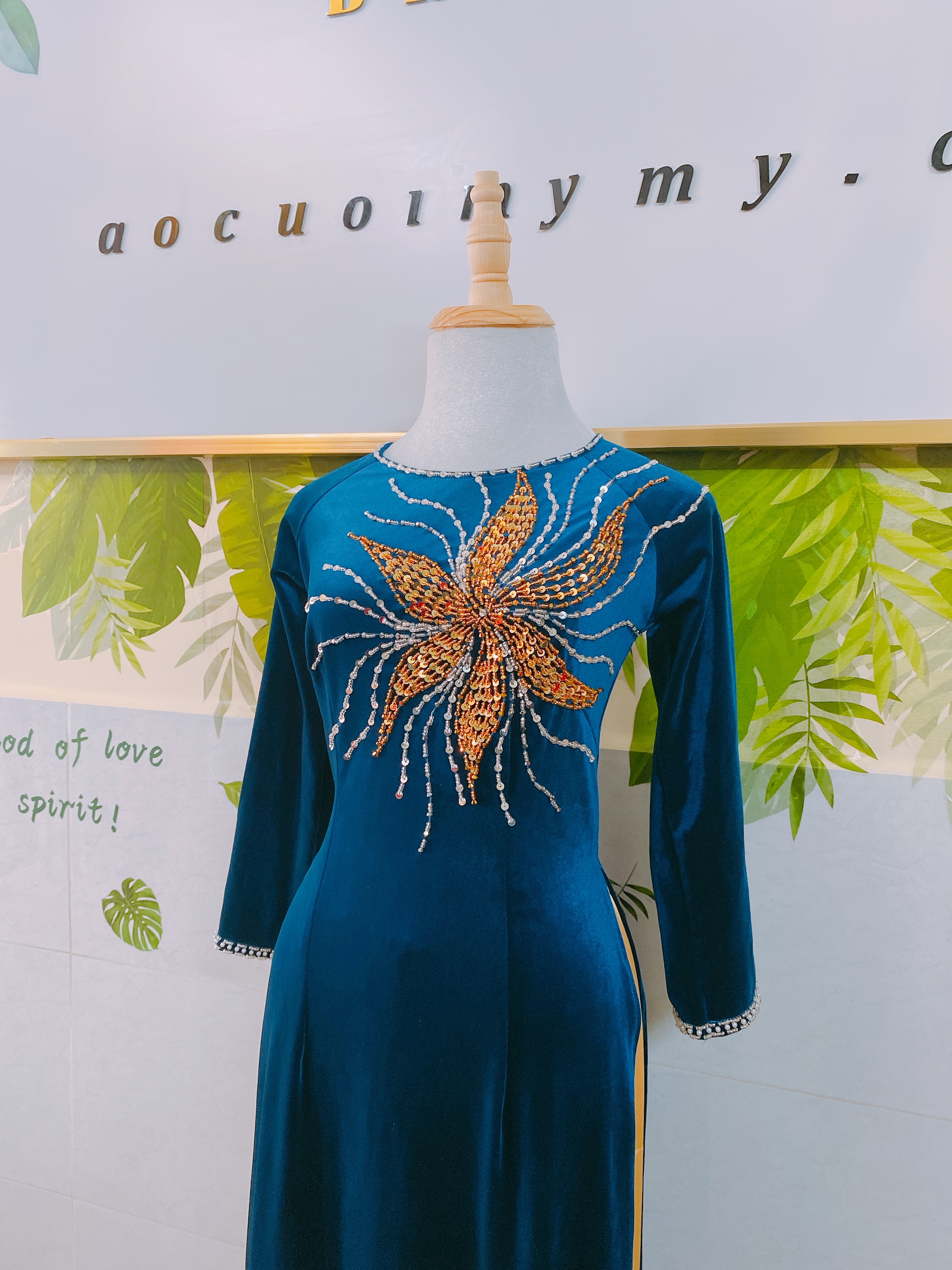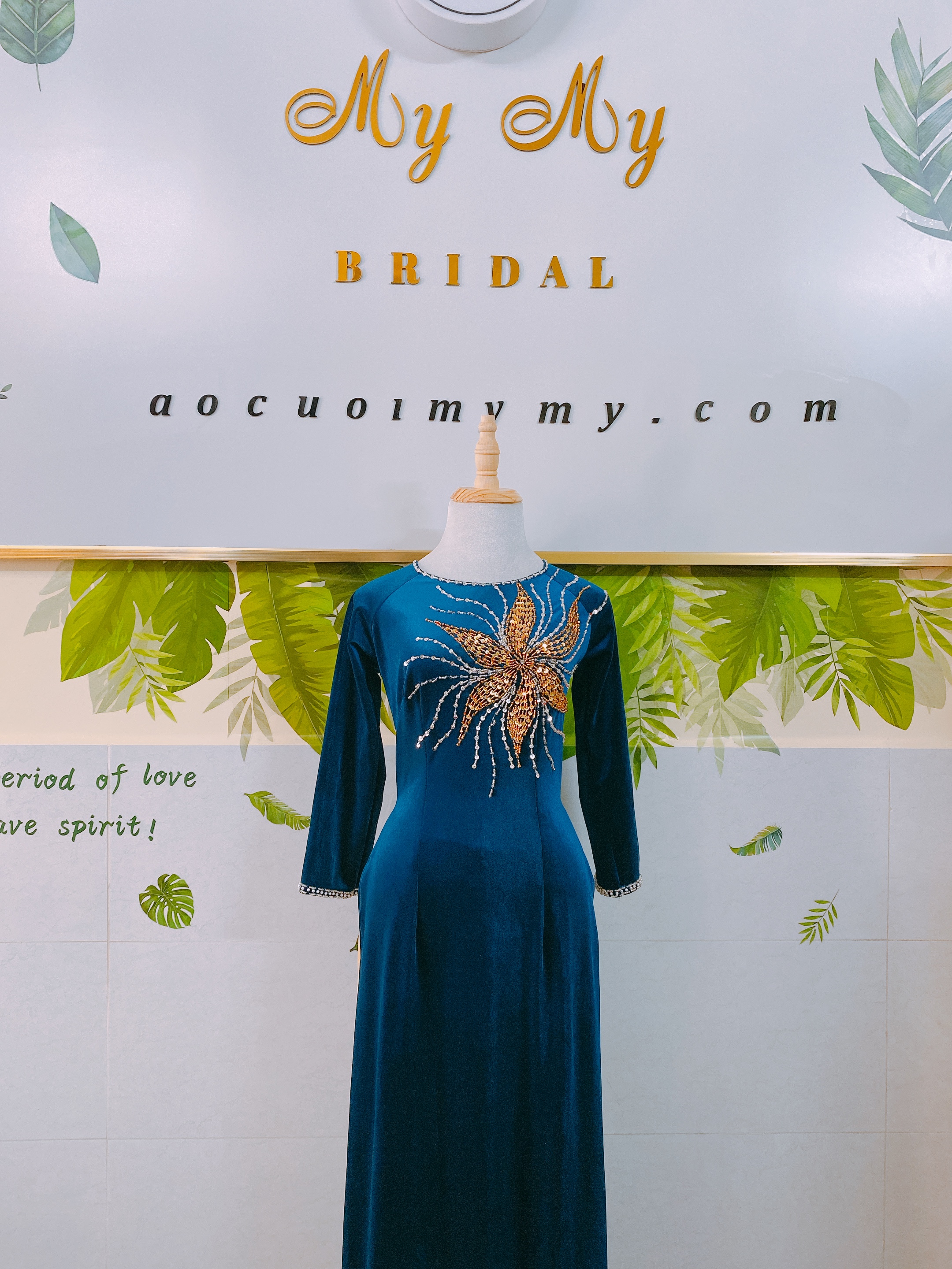 Áo dài bà sui nhung xanh cổ vịt đính pha lê