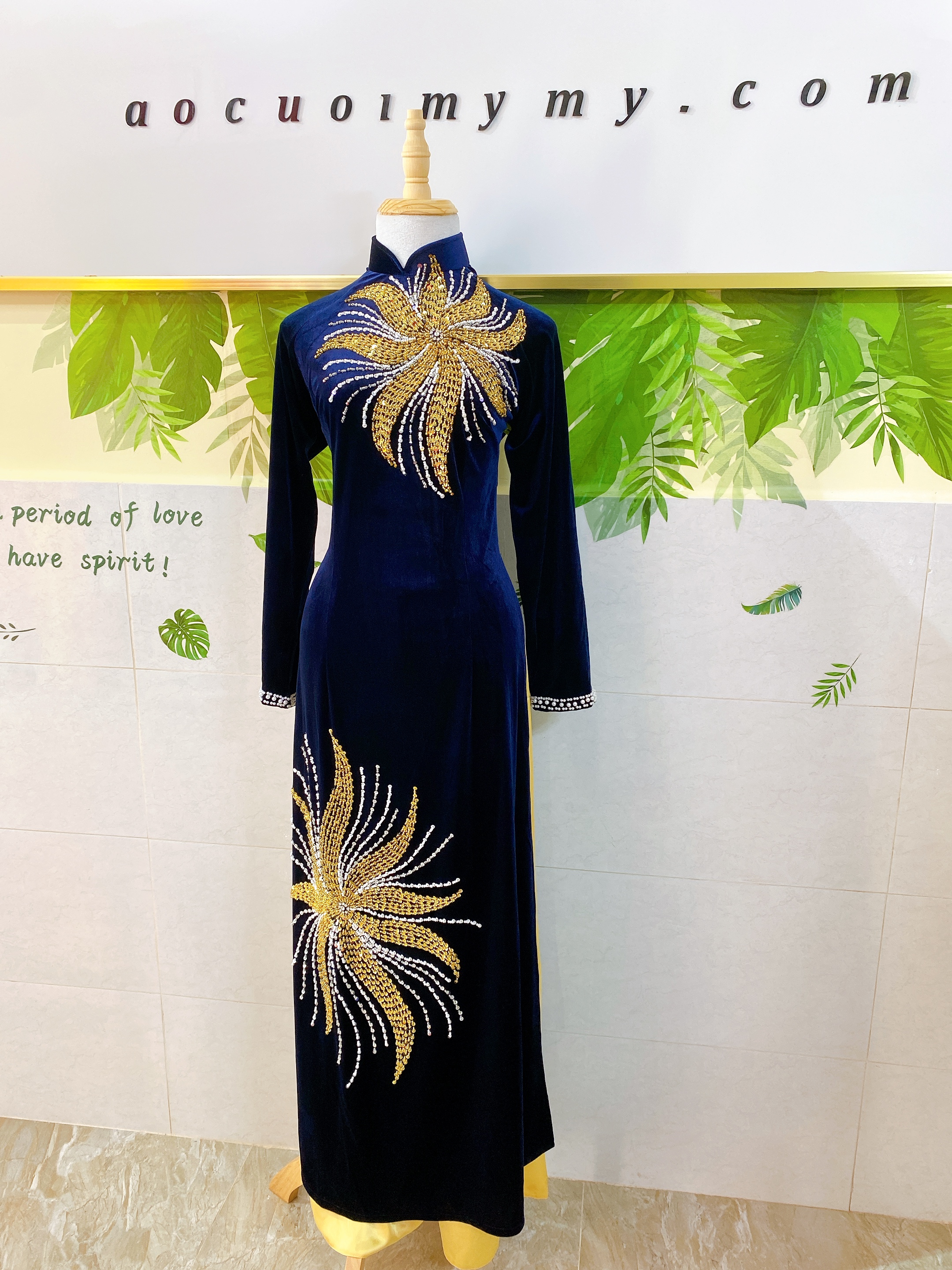 ÁO DÀI BÀ SUI NHUNG XANH ĐEN ĐÍNH PHA LÊ