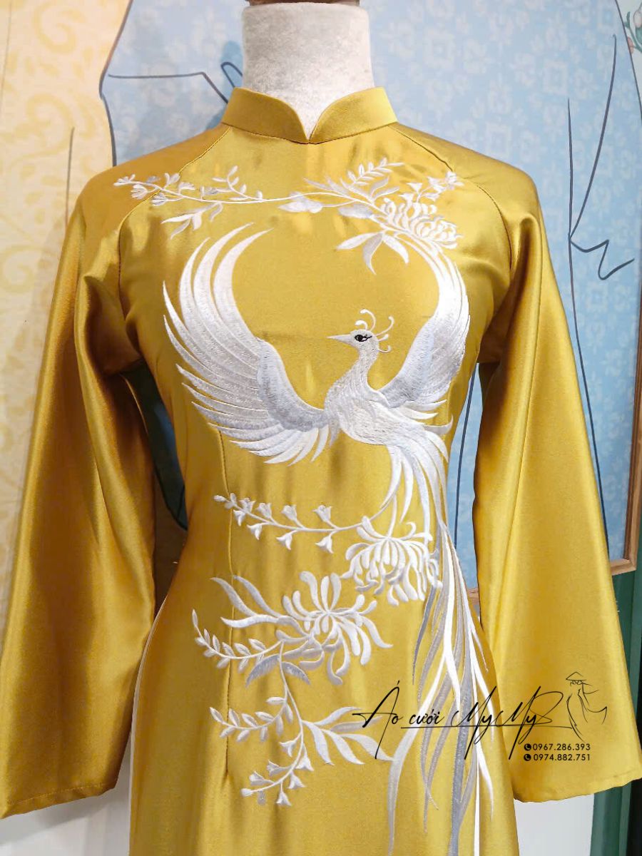 Họa tiết: Phượng hoàng trắng được thêu tay tinh xảo kết hợp hoa văn nhẹ nhàng chạy dọc thân áo.