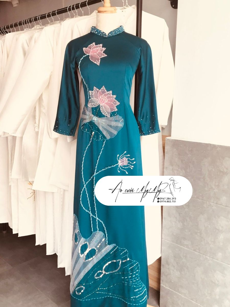 Áo dài bà sui màu xanh bích đính kết hoa sen với chất liệu lụa queen