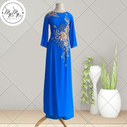 Áo dài bà sui màu xanh dương phù hợp với các mẹ có làn da sáng, họa tiết đính kết chéo ở vai và eo sẽ che tốt khuyết điểm