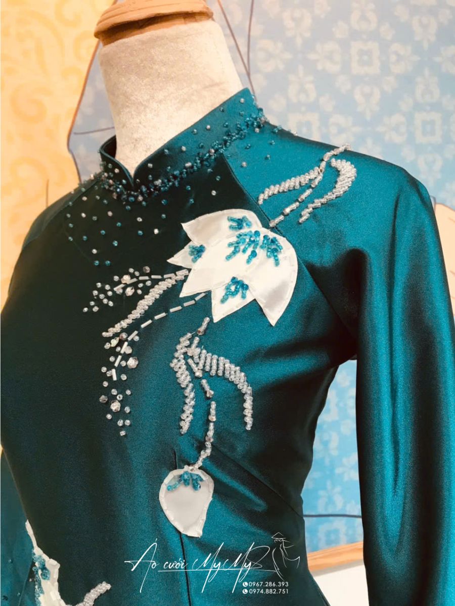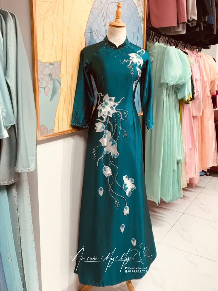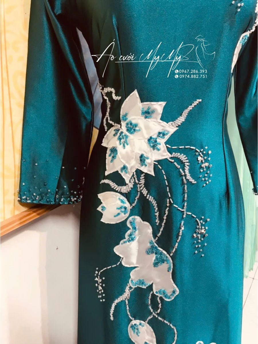 Tôn vinh nét đẹp quý phái với mẫu áo dài bà sui màu xanh đính kết hoa rơi đầy nghệ thuật. Thiết kế tinh xảo với chất liệu lụa bóng cao cấp, điểm nhấn là những bông hoa rơi mềm mại được kết đá thủ công tỉ mỉ, tạo nên vẻ đẹp nhẹ nhàng mà sang trọng, lý tưởng cho các dịp lễ cưới trang trọng.