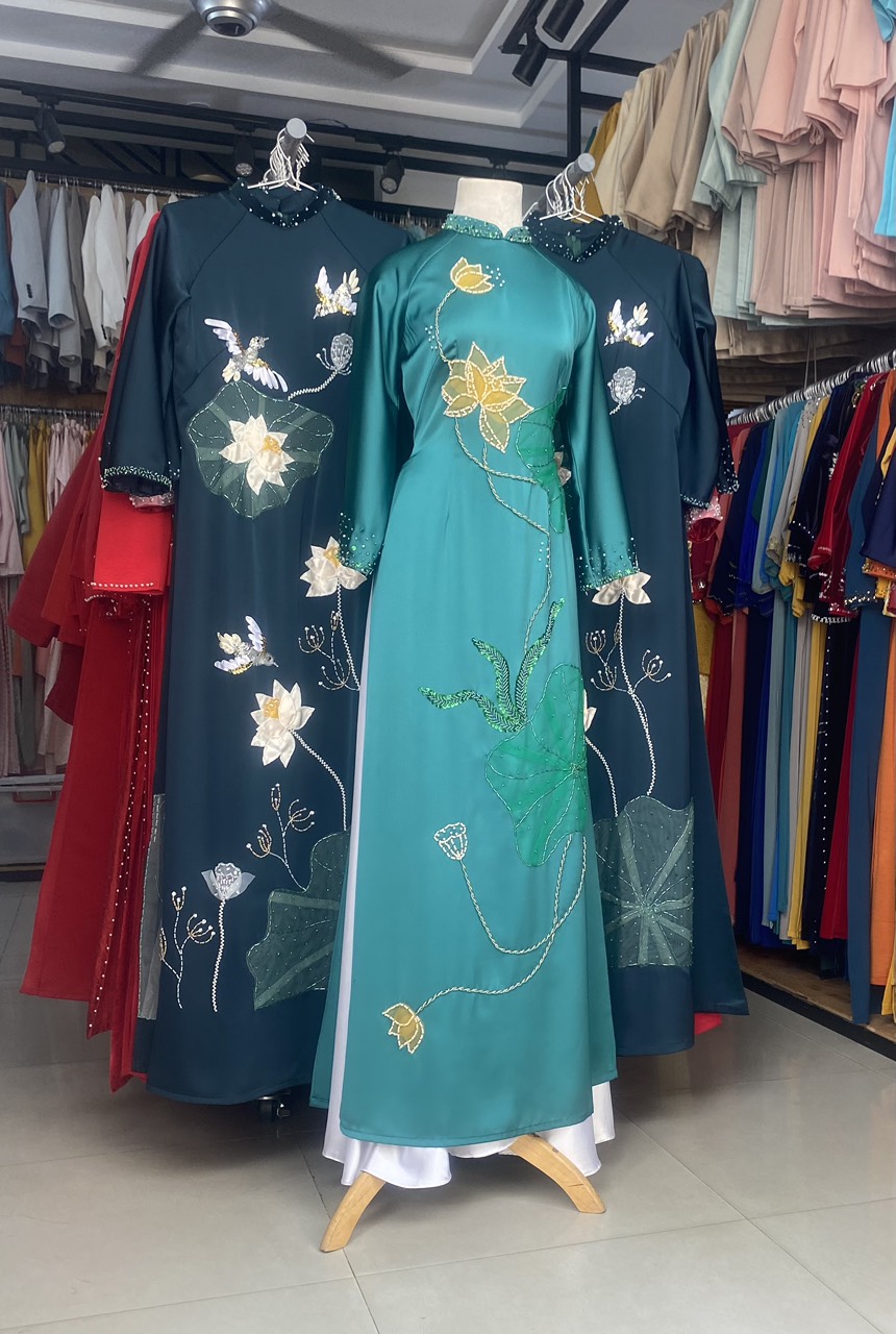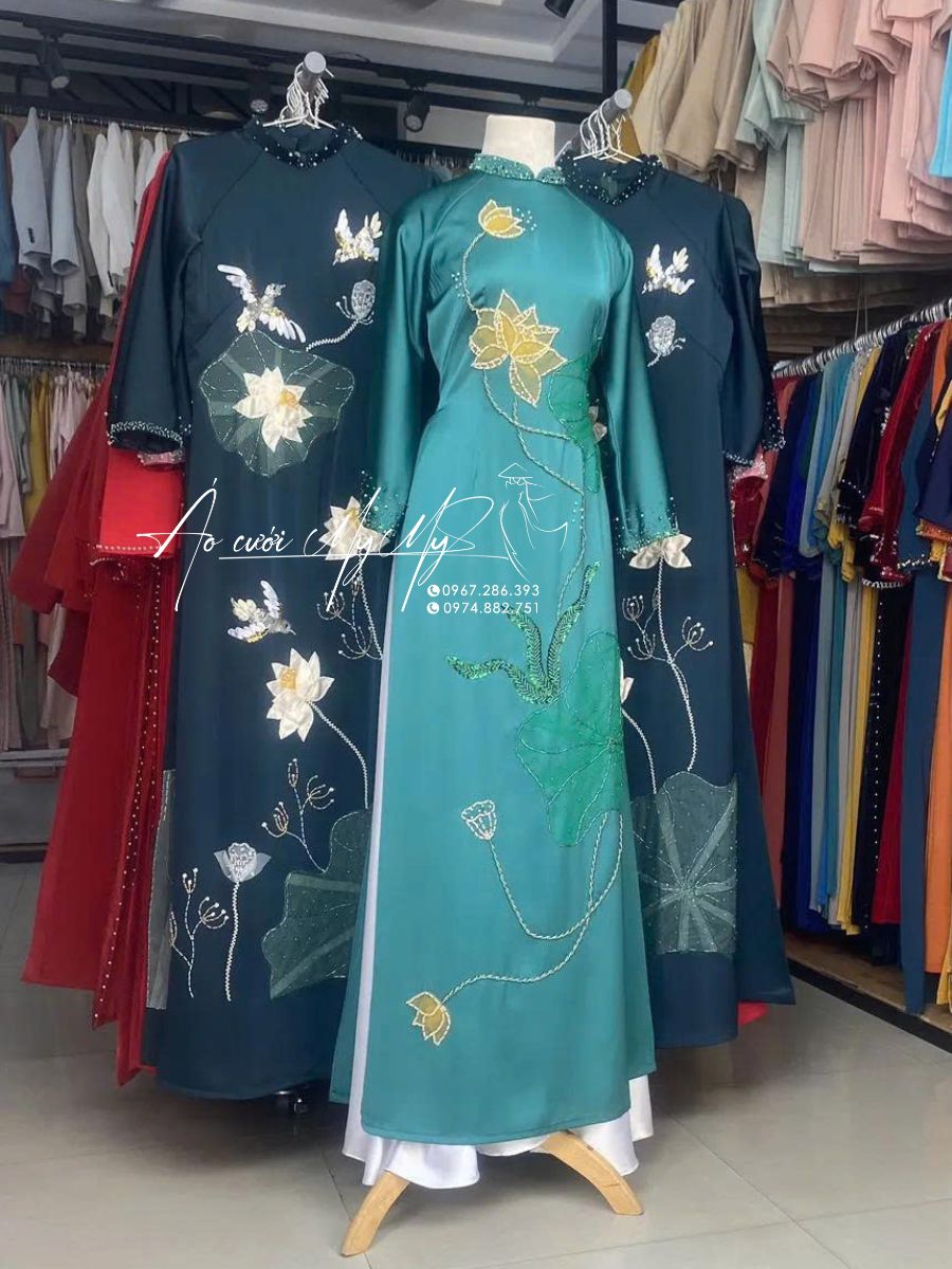 Áo dài bà sui màu xanh ve đính kết hoa sen vàng