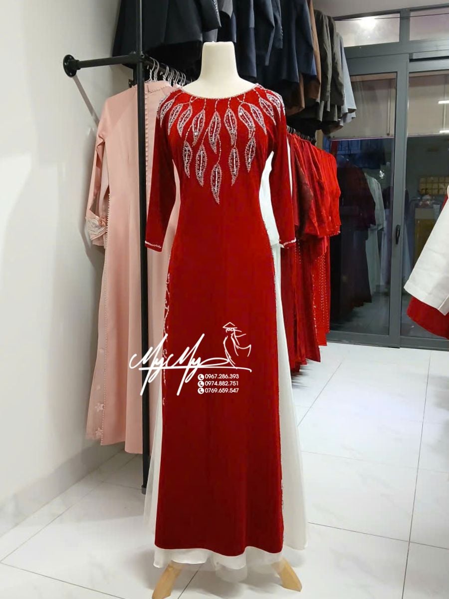Thiết kế áo dài sui màu đỏ rực rỡ – gam màu biểu tượng cho may mắn, nổi bật trong các dịp lễ, sự kiện và ảnh chụp. Điểm nhấn đặc biệt nằm ở phần cổ áo với họa tiết đính đá ánh bạc hình lá rơi xuống tinh tế, tạo ra hiệu ứng thu hút.