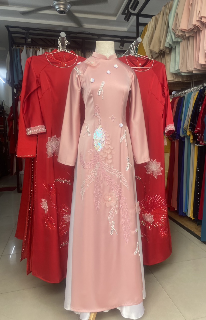 Áo dài bà sui đính kết hoa và chuồn chuồn trên nền vải hồng