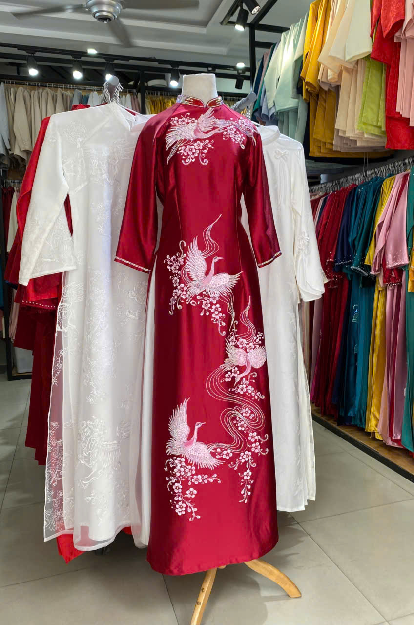 ÁO DÀI SUI HỒNG THÊU HẠC VÀ HOA MAI