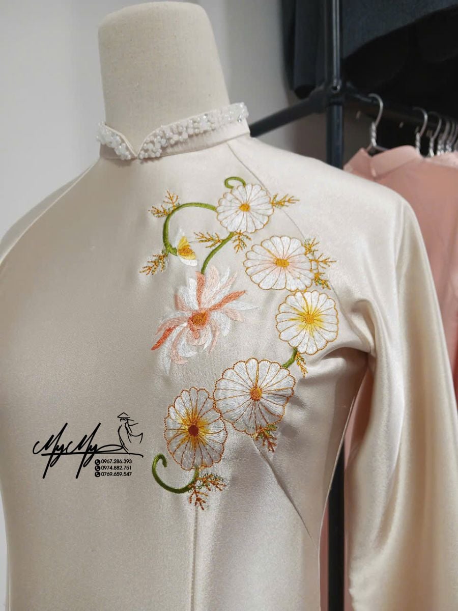 🧵 Họa tiết: Họa tiết hoa nhí tinh tế chạy dọc thân áo, kết hợp gam màu pastel nhẹ nhàng tạo hiệu ứng thanh thoát, bay bổng. Các chi tiết được chăm chút tỉ mỉ, mang đến vẻ đẹp trang nhã, rất phù hợp với phong cách truyền thống mà hiện đại.