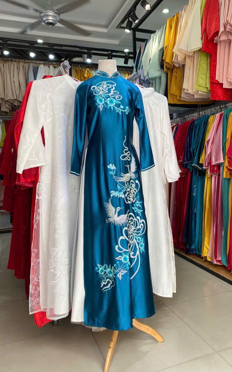 ÁO DÀI SUI XANH THÊU HOA CÚC VÀ CHIM HẠC