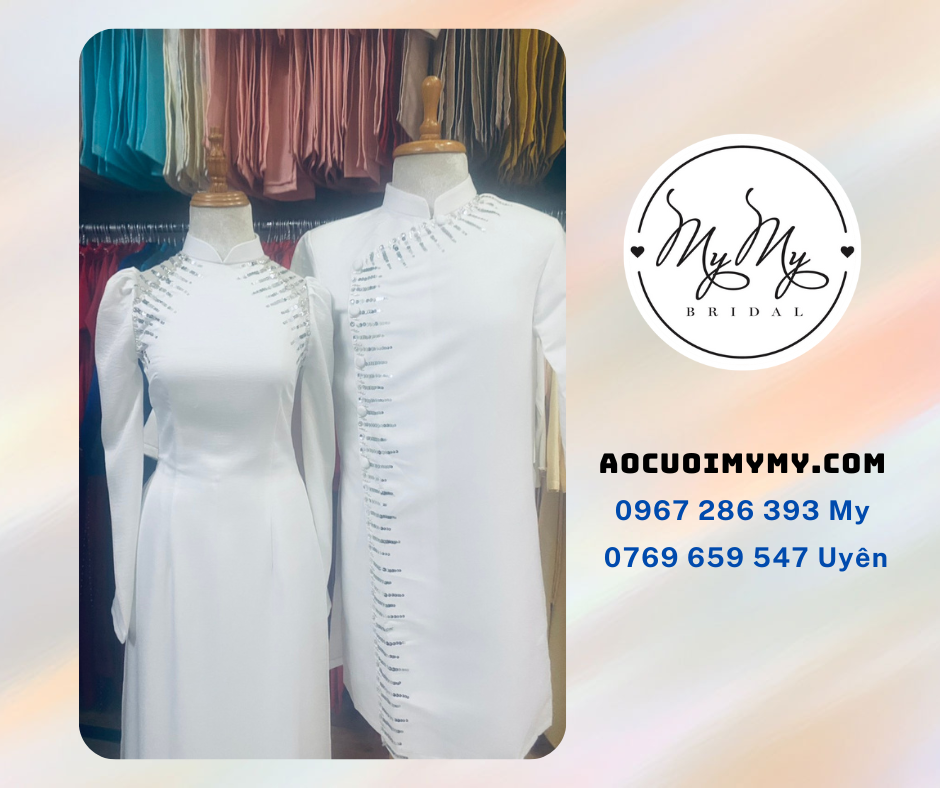 ÁO DÀI CẶP CÔ DÂU CHÚ RỂ TONE TRẮNG ĐÍNH KẾT NỔI BẬT CÁ TÍNH