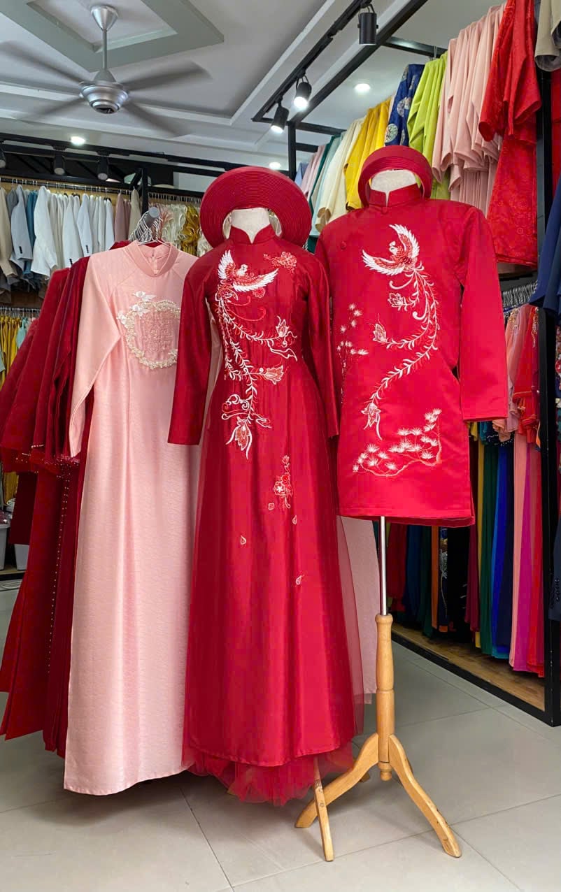 👗 Áo dài nữ: Thiết kế truyền thống duyên dáng với màu đỏ nổi bật, họa tiết thêu chim hỷ tước trên cành mai mang ý nghĩa may mắn và hạnh phúc. Kết hợp cùng mấn đội đầu giúp tôn lên vẻ thanh lịch, sang trọng.