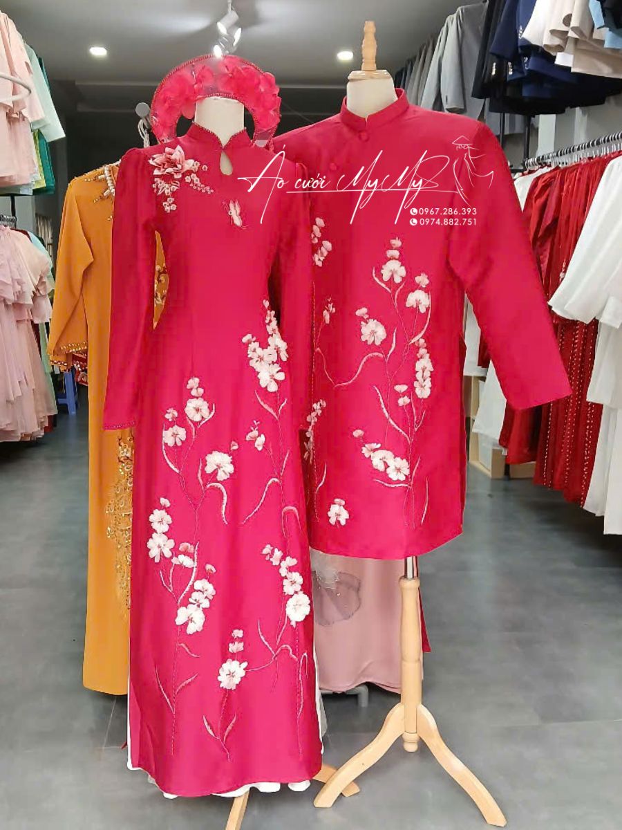 ÁO DÀI CƯỚI CẶP ĐỎ KẾT HOA