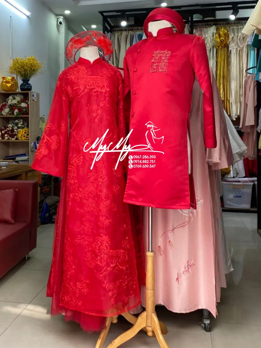 - Màu sắc: Đồng bộ với áo dài nữ, màu đỏ tượng trưng cho sự thịnh vượng.