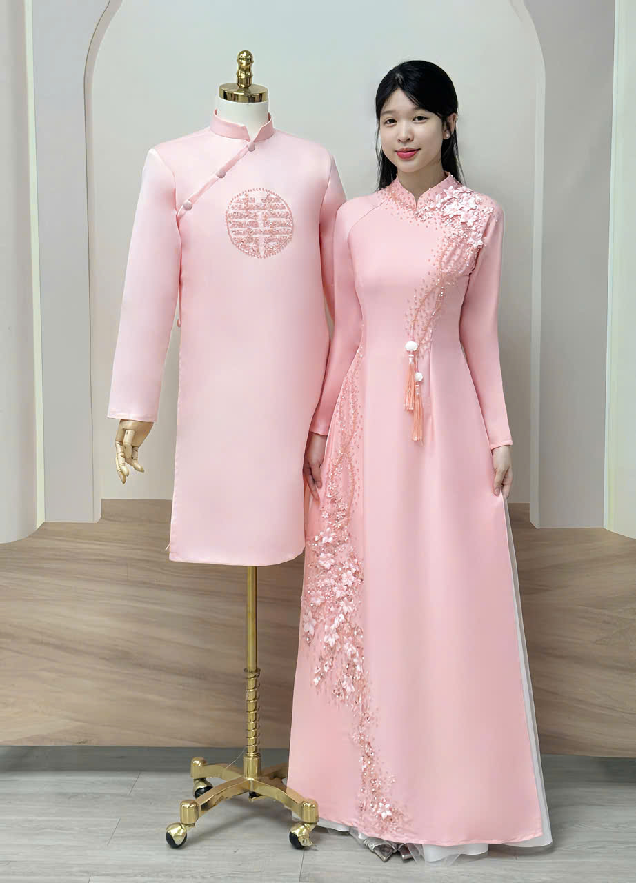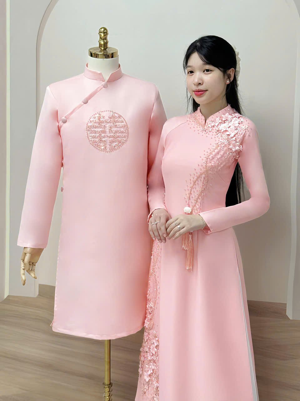 ÁO DÀI CƯỚI CẶP HỒNG KẾT HOA
