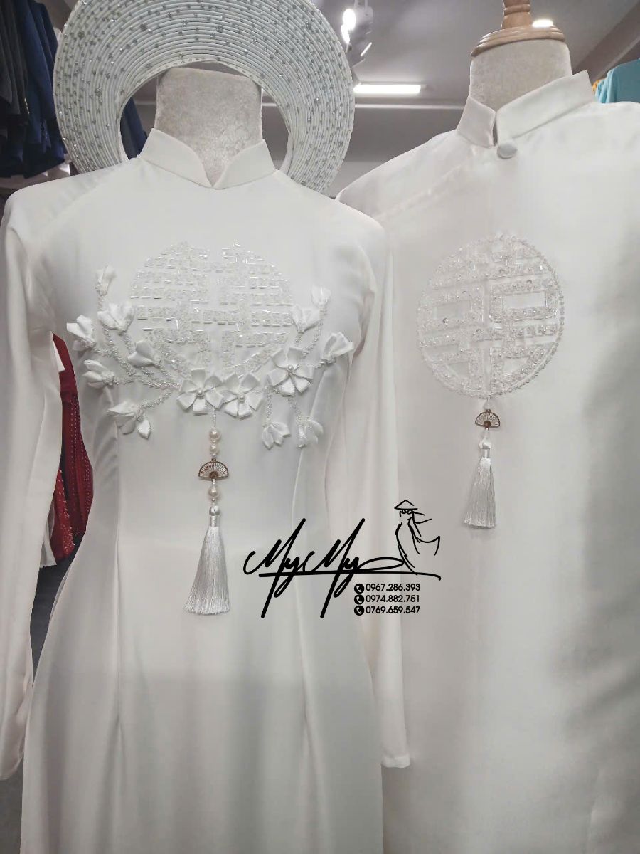 Mẫu áo dài trắng cao cấp dành cho cô dâu chú rể, thiết kế nổi bật với họa tiết chữ Hỷ và hoa được kết nổi bằng hạt pha lê, tạo nên tổng thể vừa truyền thống hiện đại.