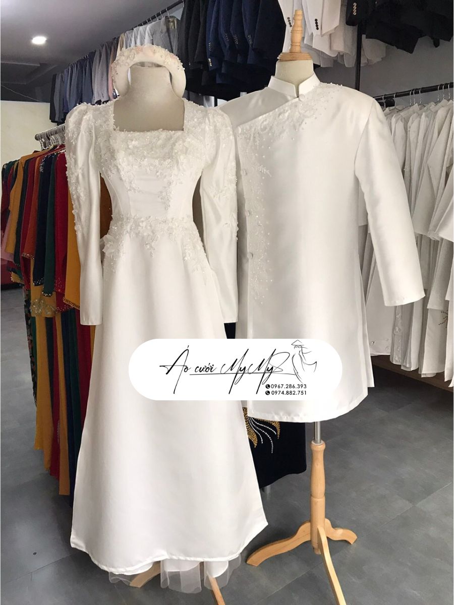 - Áo dài chú rể: Đơn giản nhưng tinh tế với phần ngực áo được điểm xuyết bởi các chi tiết kết pha lê, tạo sự mạnh mẽ và hiện đại cho chú rể. Kiểu dáng ôm vừa vặn mang lại sự lịch lãm và trang trọng.