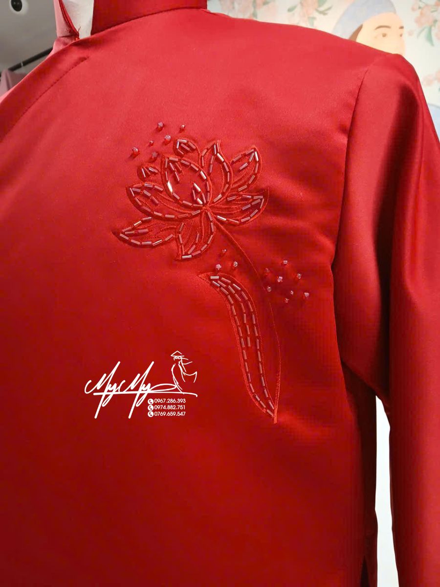 Áo dài chú rể đỏ họa tiết hoa sen là loại lựa chọn lý tưởng cho các quý ông trong ngày trọng đại. Thiết kế hiện đại kết hợp tinh hoa truyền thống, tôn lên sự nam tính và đồng điệu cùng cô dâu.