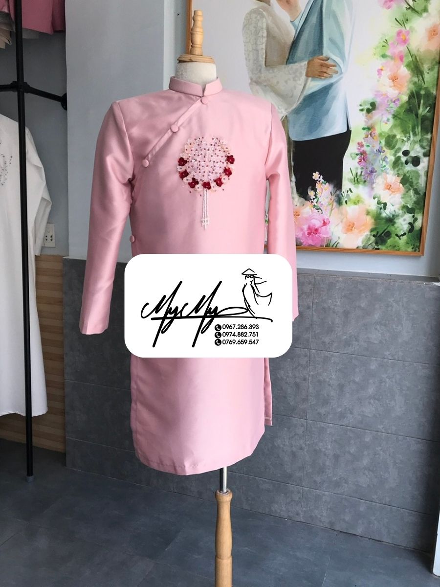 - Màu sắc độc đặc: Màu hồng nhạt mang ý nghĩa lãng mạn và dịu dàng, tạo nên sự khác biệt so với các gam màu áo dài cưới truyền thống. Đây là lựa chọn lý tưởng cho những chú rể yêu thích sự mới mẻ nhưng vẫn giữ được vẻ đẹp tinh tế.