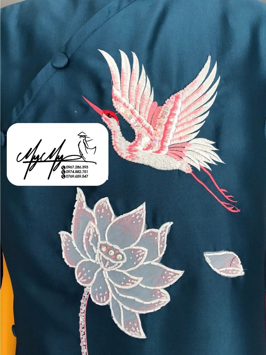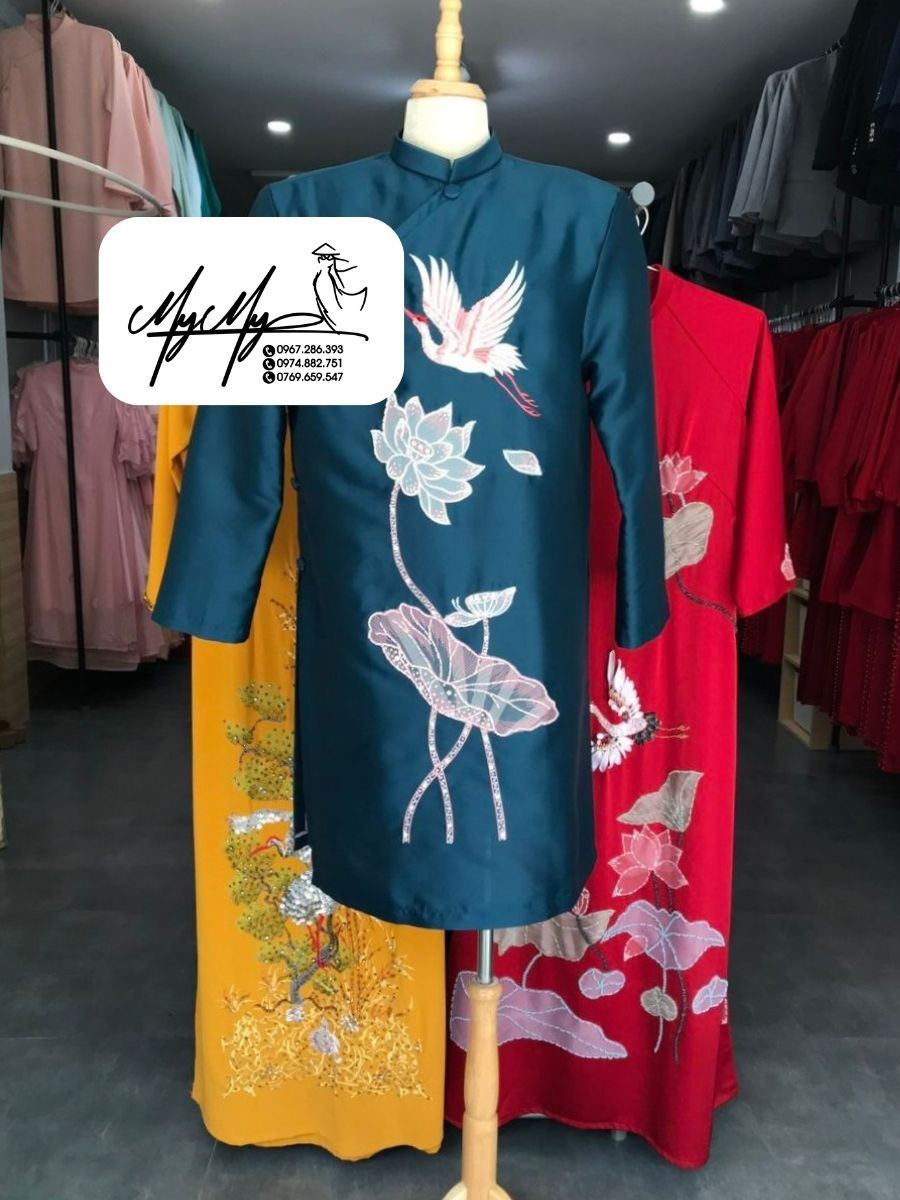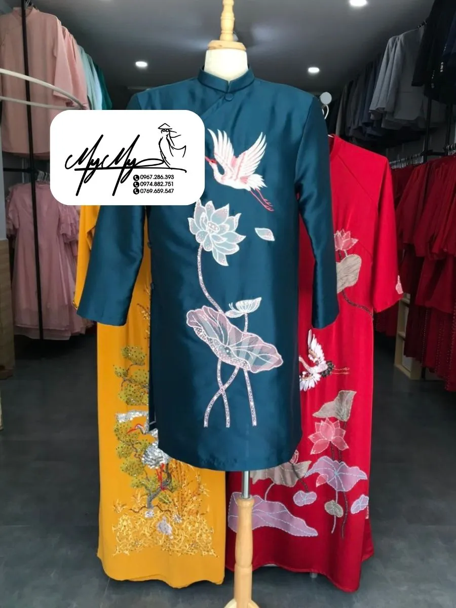 - Chi tiết độc đáo: Áo dài chú rể với màu xanh, nhấn mạnh là họa tiết hoa sen và chim sếu – biểu tượng của sự thanh cao và may mắn.