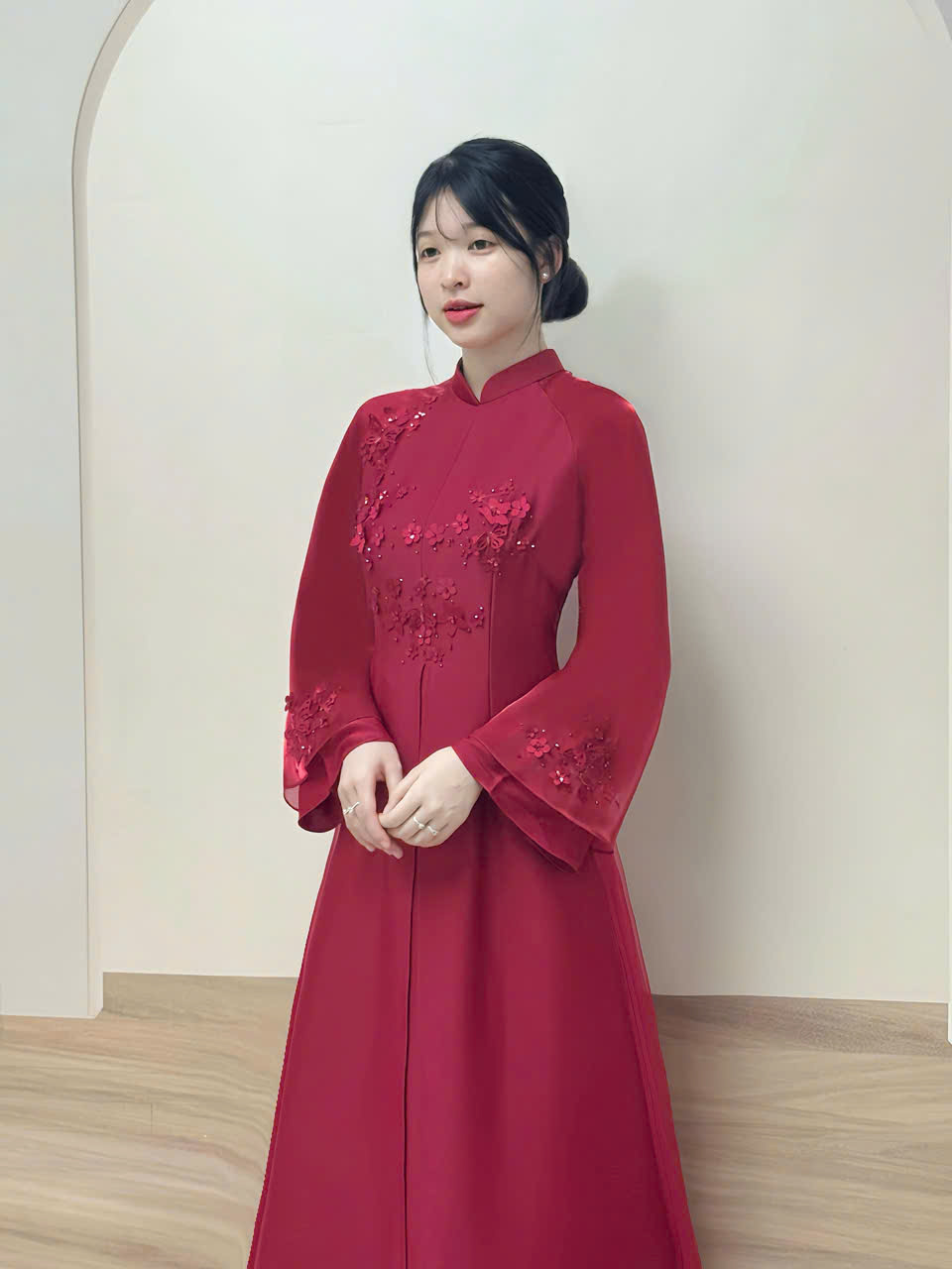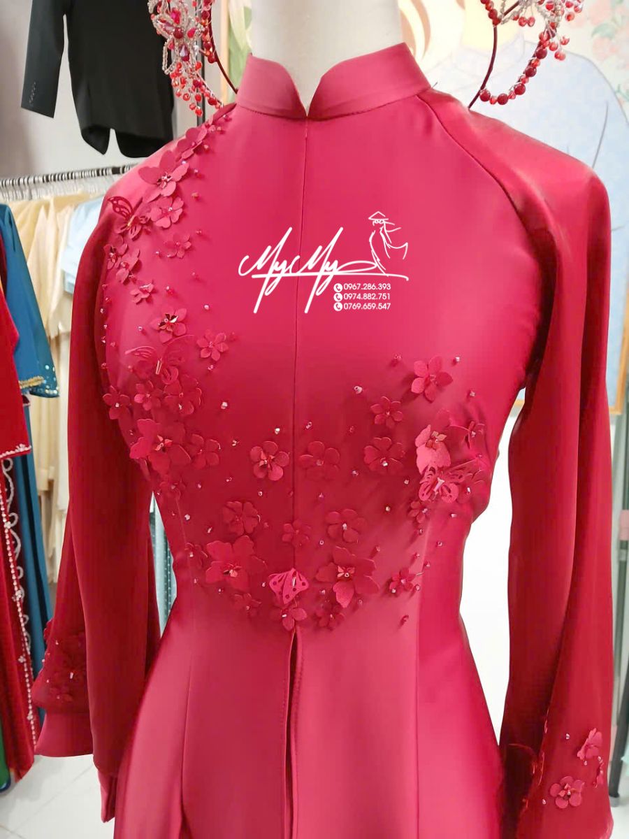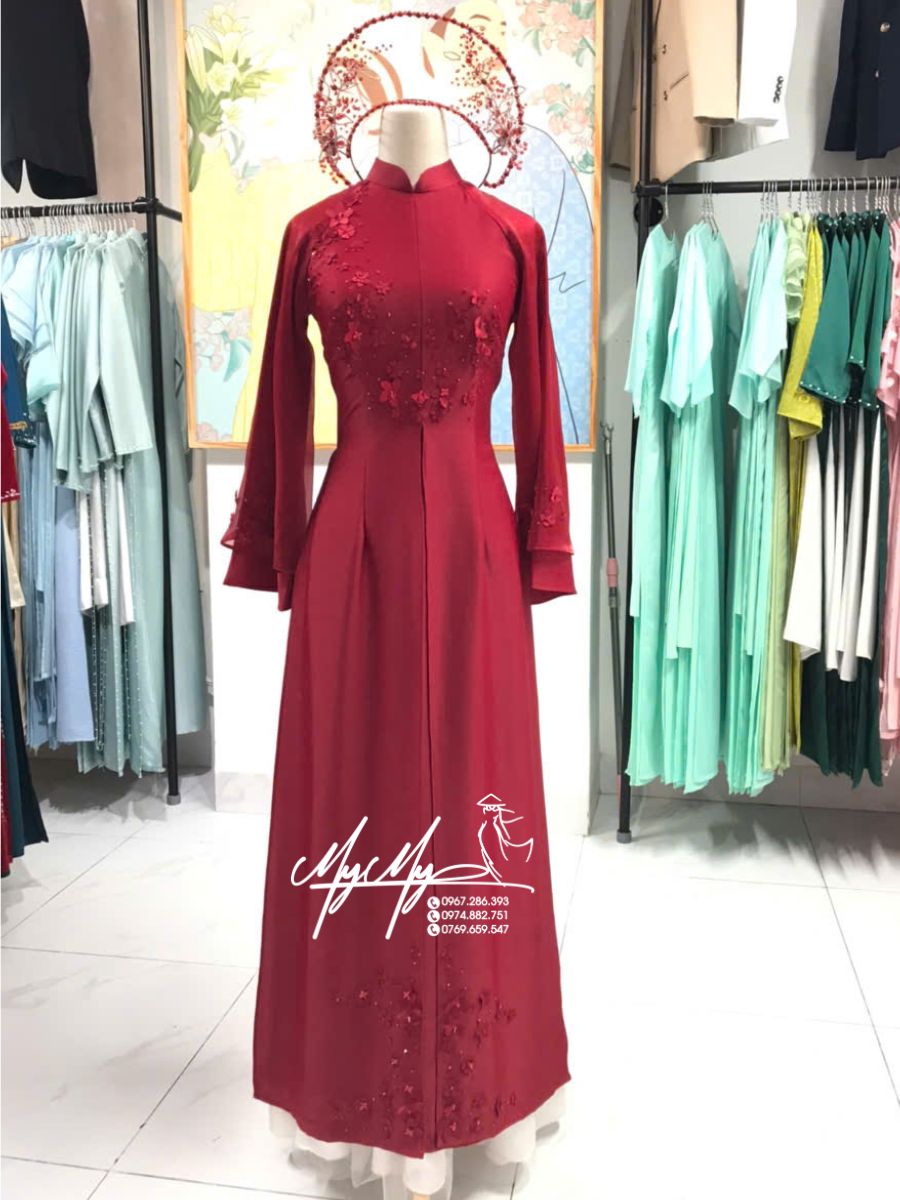 Mẫu áo dài cô dâu màu đỏ đô đính hoa nổi 3D mang đến vẻ ngoài quý phái, rạng rỡ và đầy khí chất cho nàng trong ngày lễ vu quy, đón dâu hay chụp hình cưới. Sắc đỏ đô sang trọng kết hợp hoa đính thủ công khéo léo, giúp tôn dáng, tôn da và tạo điểm nhấn nổi bật.