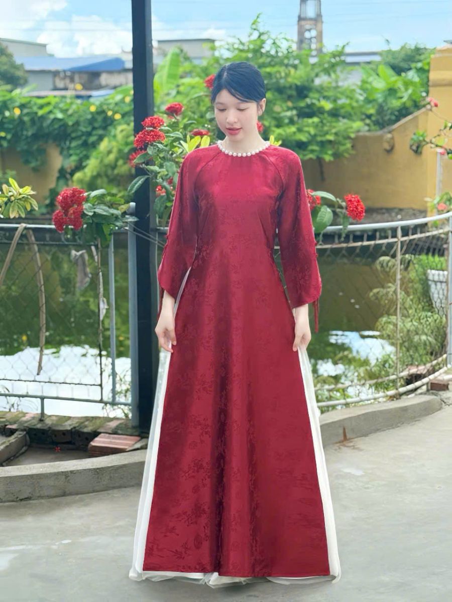 Áo dài cô dâu đỏ đính kết là mẫu thiết kế sang trọng, nổi bật với sắc đỏ truyền thống tượng trưng cho may mắn và hạnh phúc. Áo được may từ vải gấm cao cấp, mềm mịn, họa tiết hoa văn cổ điển dập chìm tỉ mỉ, tạo chiều sâu và sự thanh lịch cho tổng thể. Phần cổ tròn được đính kết chuỗi ngọc trai tinh xảo, tăng thêm vẻ kiêu sa cho cô dâu trong ngày cưới. Tay áo dài xẻ nhẹ, dáng suông che khuyết điểm hiệu quả, tôn vóc dáng người mặc. Phù hợp cho các lễ cưới truyền thống, ăn hỏi hoặc chụp ảnh cưới. Dịch vụ cho thuê tại Áo cưới MyMy cam kết áo mới, form chuẩn, hỗ trợ chỉnh sửa theo số đo.