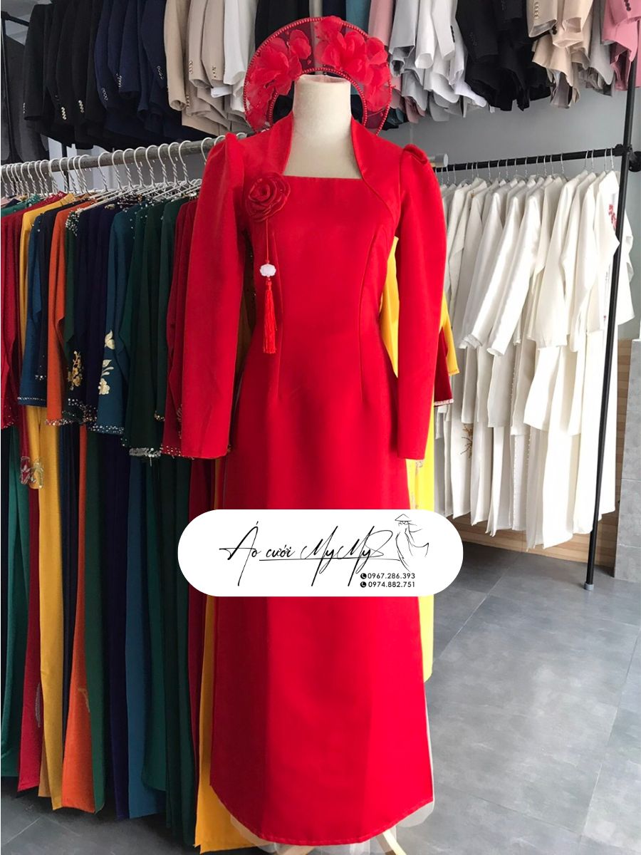 - Thiết kế: Áo dài với cổ nữ hoàng hiện đại, tay phồng nhẹ tạo nét mềm mại, đi kèm với chiếc mấn đỏ tôn lên vẻ đẹp truyền thống. Phần ngực áo được trang trí bằng một bông hoa hồng lớn tạo điểm nhấn tinh tế, kết hợp với sợi tua rua thả nhẹ.