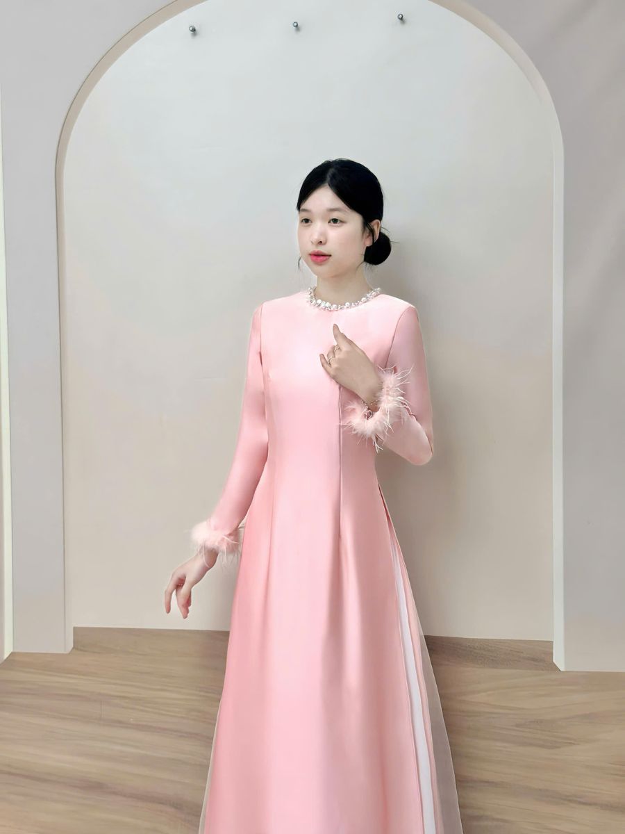 Nếu bạn đang tìm kiếm một thiết kế áo dài cô dâu hồng hiện đại vừa sang trọng vừa tinh tế, thì mẫu áo dài cô dâu hồng tay kết lông vũ bằng lụa Queen chính là lựa chọn lý tưởng.