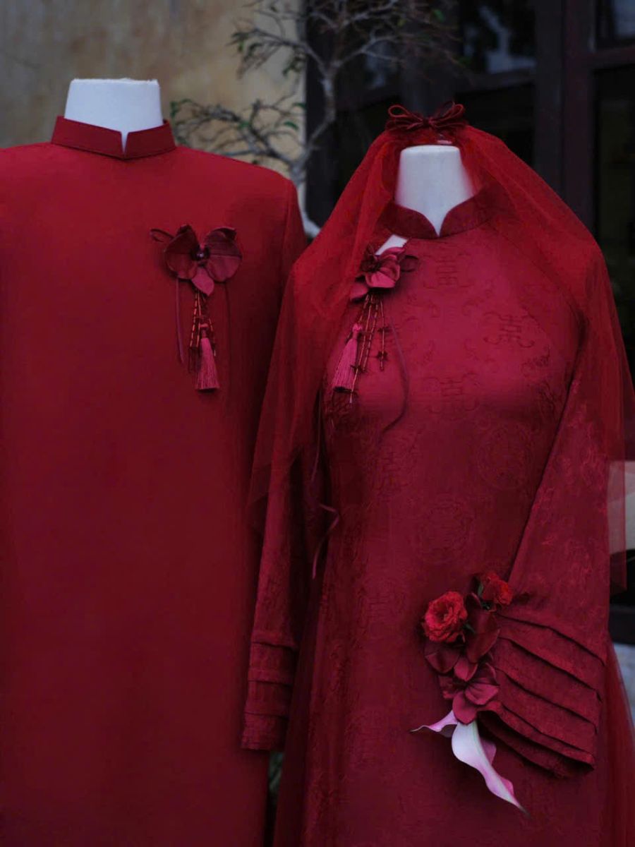 ÁO DÀI CƯỚI CẶP ĐỎ KẾT HOA