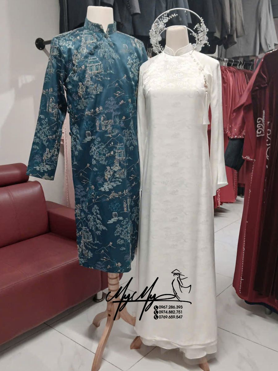 Nếu bạn đang tìm áo dài cưới cho thuê đẹp, sang trọng và ý nghĩa thì mẫu áo dài cưới cặp dâu lụa Nha Xá họa tiết thủy mặc – chú rể gấm xanh chính là loại lựa chọn hoàn hảo.
