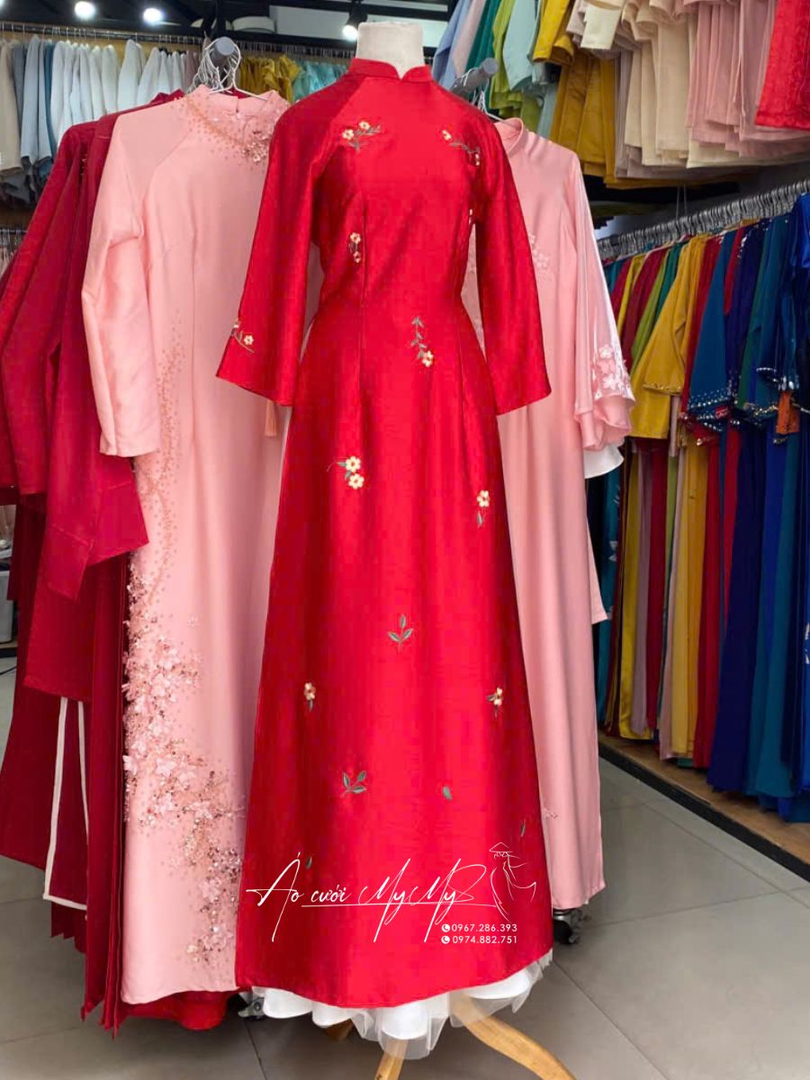 Áo dài nữ màu đỏ dịu dàng, thêu hoa nhí nhẹ nhàng trên nền lụa – phù hợp chụp ảnh, đi lễ hoặc sự kiện thanh lịch.