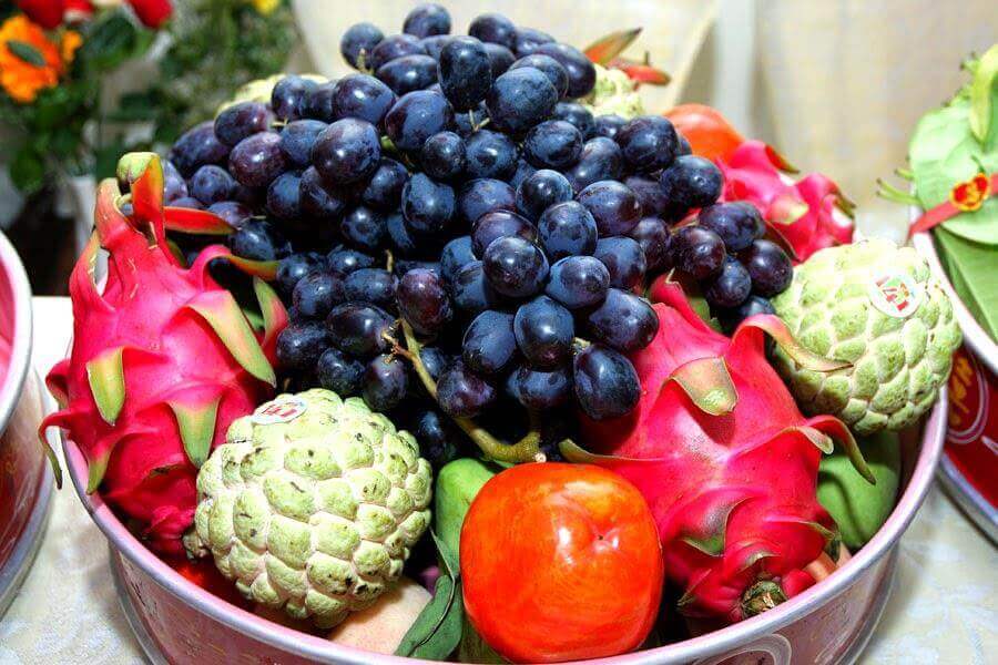 Mâm trái cây cũng là lễ vật không thể thiếu, thường được gọi là “mâm ngũ quả”, nghĩa là năm loại trái cây khác nhau, dùng để trên bàn thờ tổ tiên hoặc trên bàn tiếp khách. Đây là món quá tặng từ thiên nhiên mang ý nghĩa cầu mong cho tình yêu và cuộc sống của cô dâu chú rể sẽ ngọt ngào và tươi mới suốt cả phần đời còn lại. Các loại trái cây bày lên thể hiện nguyện ước của gia chủ qua tên gọi, màu sắc và cách sắp xếp của chúng. Tùy theo điều kiện kinh tế của mỗi gia đình mà sẽ chọn các loại trái cây khác nhau, nhưng lưu ý nên kiêng kị trái cây có tên không may mắn như chuối, cam, lê, bom, lựu,.. và những loại trái có vị đắng, chát.