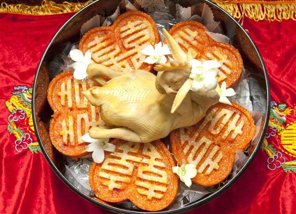 Chuẩn bị: 05 quả xôi gấc hình trái tim tim và 01 con Gà Luộc đặt ở chính giữa (để đảm bảo yếu tố “mặn” trong bộ mâm quả cưới).