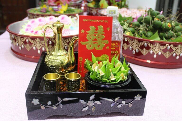 Bao gồm 01 bình rượu, 02 ly rượu, 01 đĩa trầu cau têm sẵn với số lượng chẵn ví dụ như 4, 6, hoặc 8 miếng trầu. Chú rể nên để bình rượu trống từ khi xuất phát đến khi tập trung tại nhà gái để tránh đổ rượu trong quá trình di chuyển đường dài. Hãy chuẩn bị chai rượu nhỏ kèm theo, khi dừng lại chỉnh sửa trang phục và đội ngũ trước khi vào nhà gái thì hãy rót chai rượu này vào bình rượu.